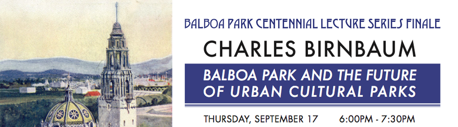 Postcard designed and distributed for the Balboa Park Centennial Lecture Series finale with landscape architect Charles Birnbaum, an event hosted in conjunction by San Diego History Center and UC San Diego Extension.