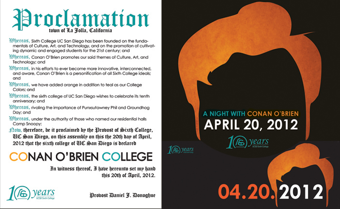I was asked to do promotional work for Conan O'Brien's surprise visit to Sixth College UC San Diego. We posted "hints" of the special guest around campus during the weeks leading up to the event, and presented Mr. O'Brien with a "proclamation" renaming the college for that day, April 20, 2012 in perpetuity.